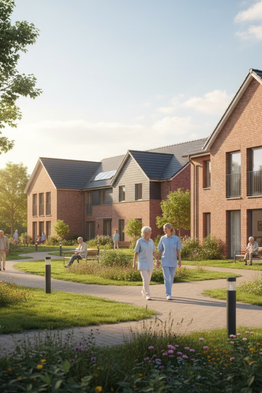 Das Herzstück unseres Konzepts. Hier entstehen moderne Mikroapartments , betreute Wohnungen , familiäre Pflegewohngemeinschaften und eine professionelle Tagespflege.